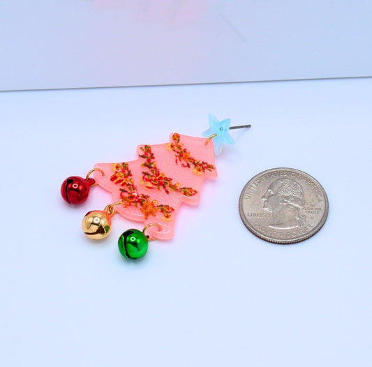Pink Acrylic/resin sparkle Christmas Tree Earrings with bells