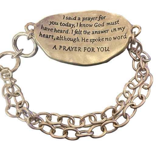 Silver tone toggle bracelet stamped with "A Prayer For You " on a gold tone cross on the front, and a prayer stamped on the back.