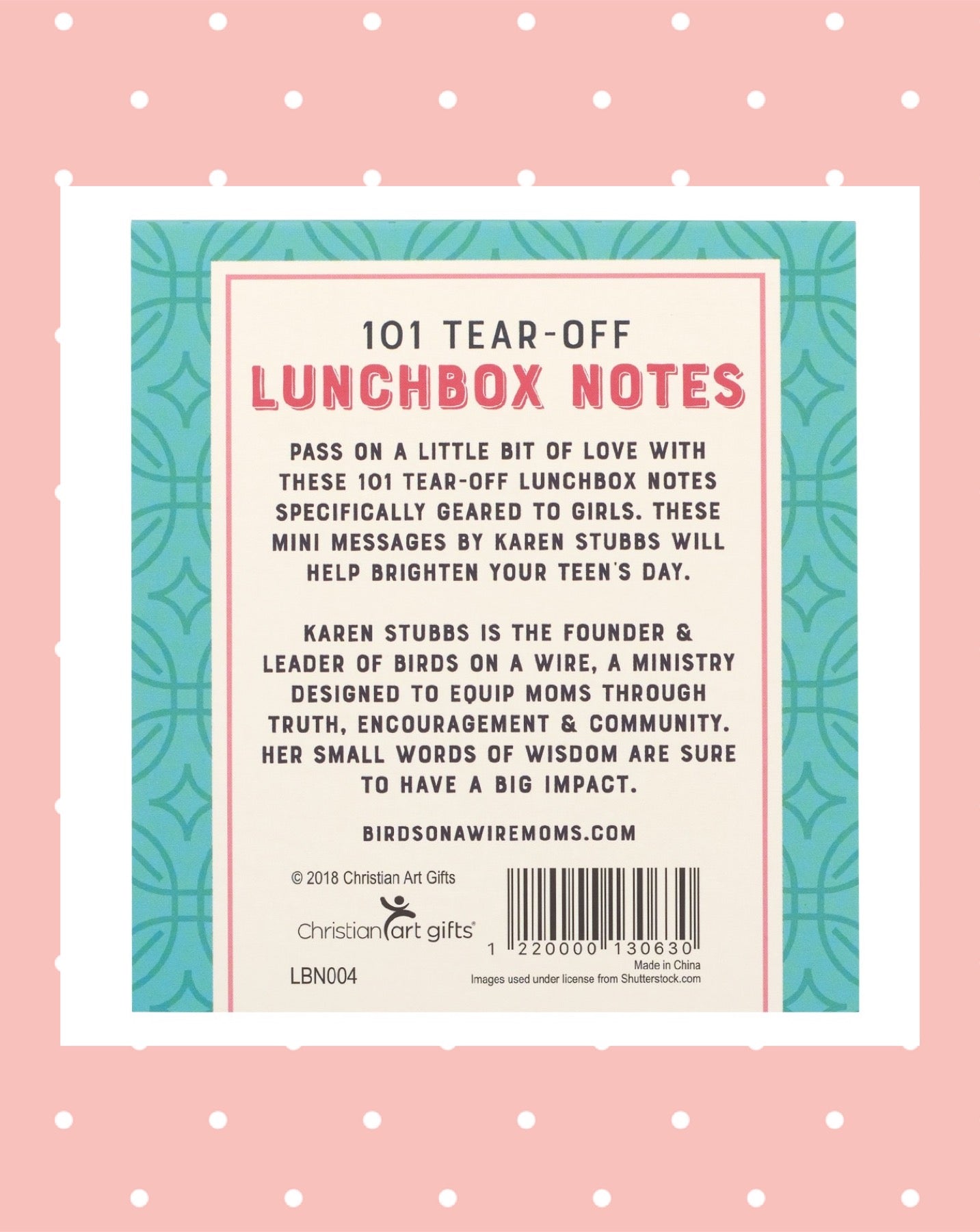 Support a mom of tween and teen girls when you give the 101 Lunchbox Notes For Girls as a small gift of encouragement or keep a set for yourself to tuck in your own children's lunchboxes. Encourage your daughter and let her know how much you care when you add a note from the 101 Lunchbox Notes For Girls in her lunch bag.