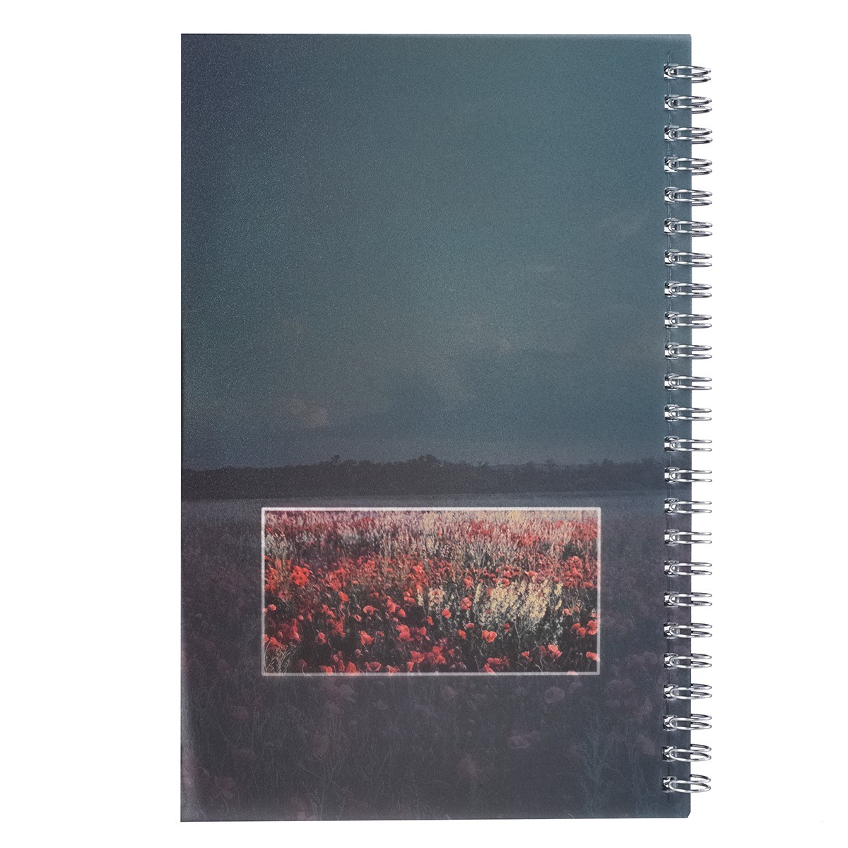 The flexible and translucent PVC cover features a full-color image of a red poppiest field that is contrasted against a greenish blue sky. The title is featured in bold white lettering.