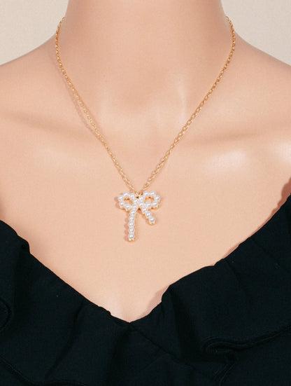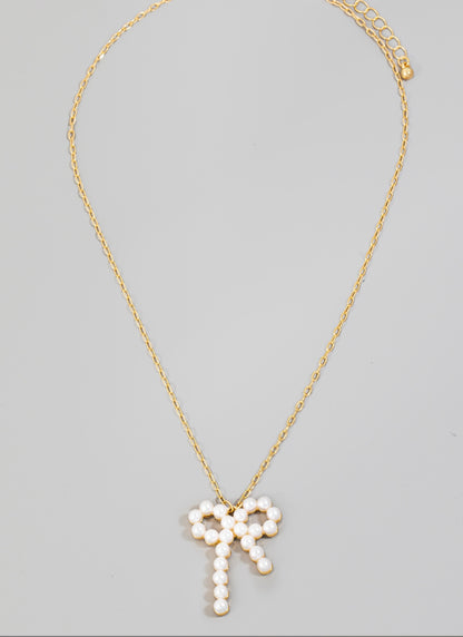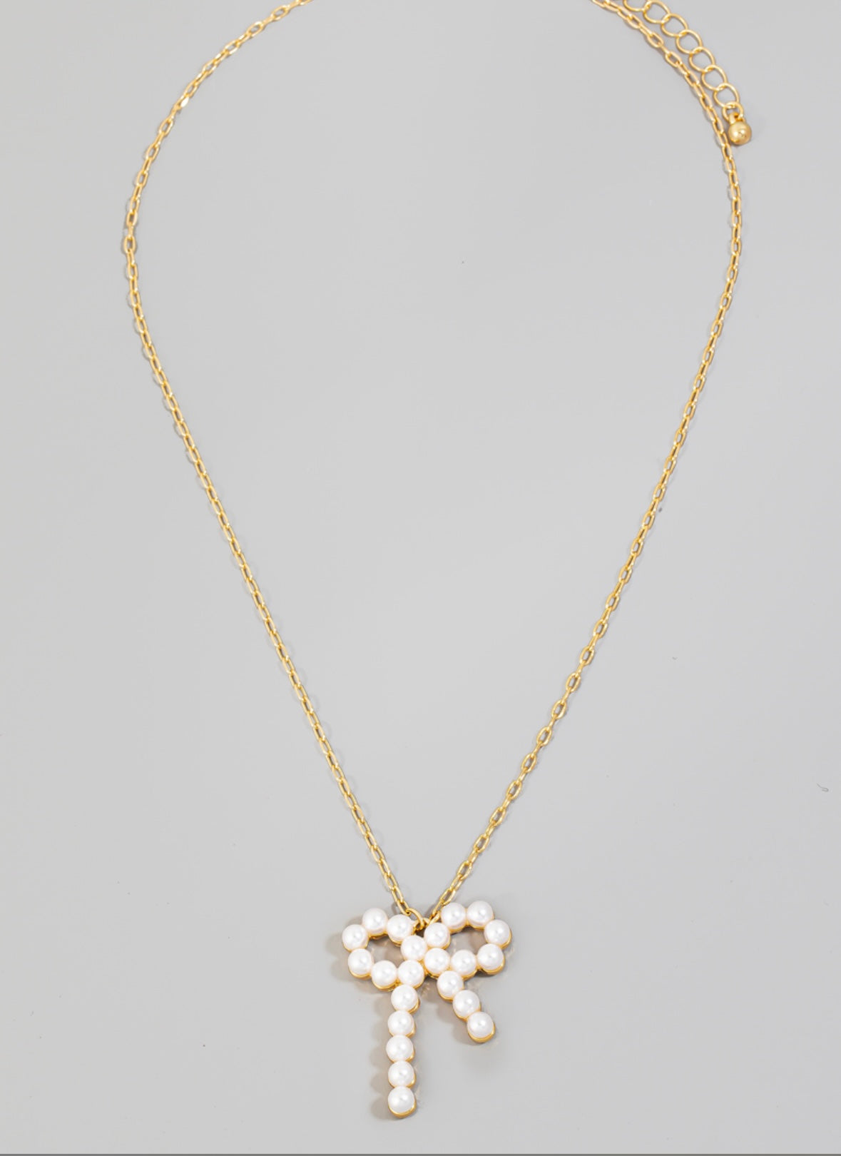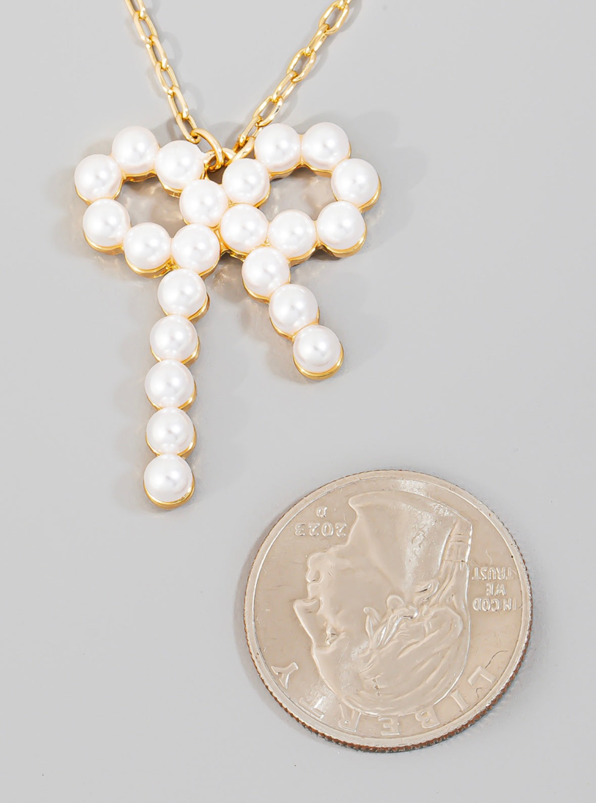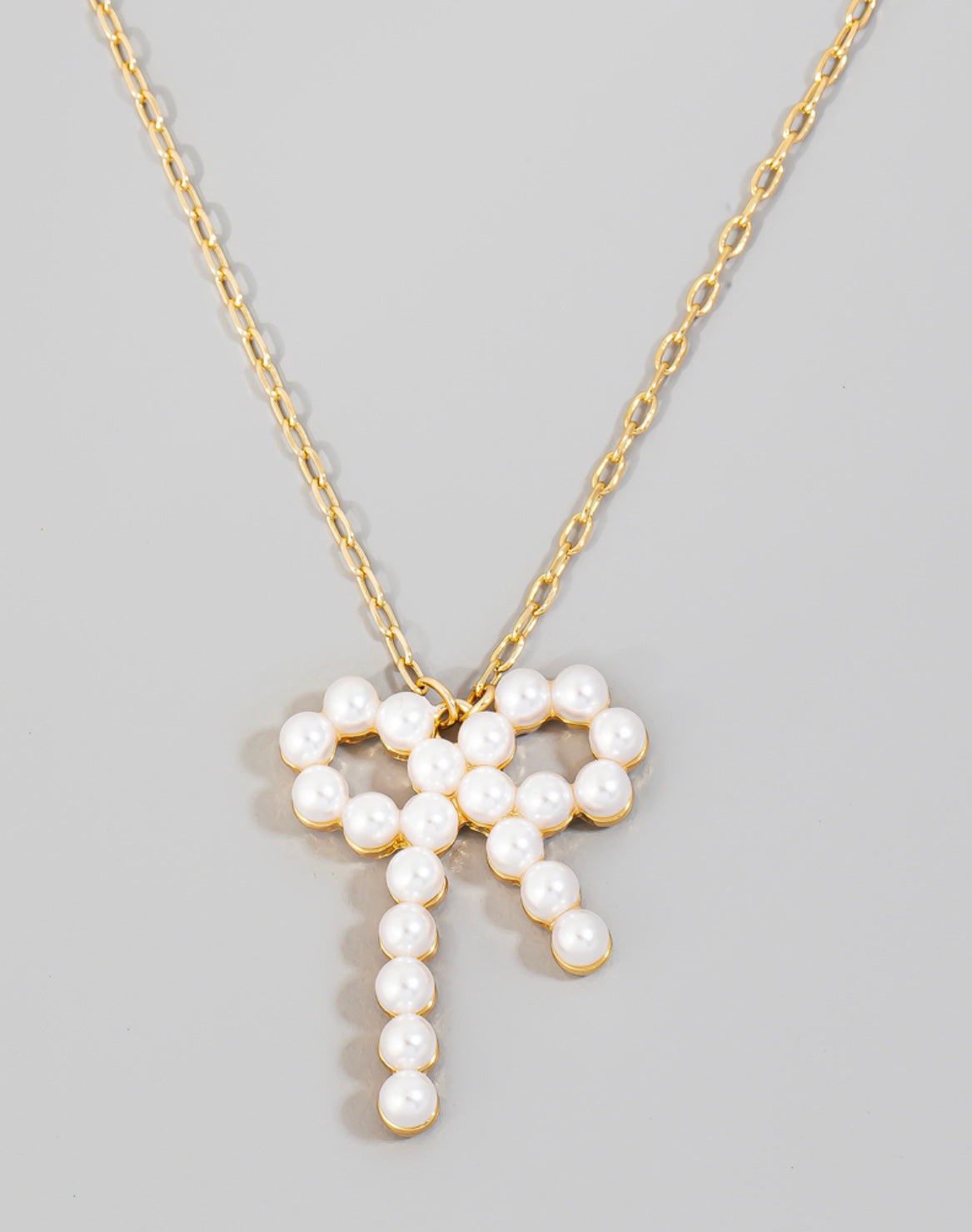 Necklace - Solid Pearl Ribbon Bow Pendant on gold Chain 18-20” adjustable extension